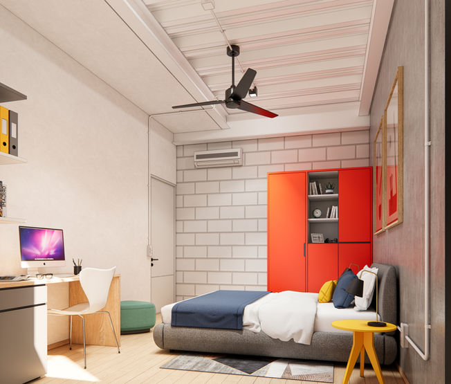 La habitación cuenta con una cama matrimonial, un escritorio ergonómico para tus horas de estudio y un armario espacioso para mantener todo organizado.